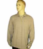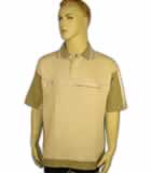 Long sleeve polo. Sleeve with self fabric cuff with 1 button placket, self fabric mock collar at neck with half zipper at front neck. Double top stitch around zipper and body low. cut and sew body. shoulder and sleeve joint with three needle wipe stitch.