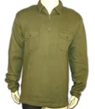 Sweat polo long sleeve. self fabric open collar at neck with 1/2 zipper inside facing. two chest pocket with flap buttons on pocket. single top stitch around collar, zipper, shoulder, armhole and sleeve end. 1x1 lycra rib at sleeve end. side slit with raw finish. hem 2 needle on body low.