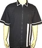 Tri colored open shirt s/s. self fabric open collar neck, contrast twill tape on collar. full zipper at front with facing. contrast twill tape on sleeve end. pocket on left chest. vertical contrast panel from pocket low to body low. cut and sewn on back with contrast fabric. hem 2 needle on sleeve and body low.