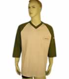 Bi colored t shirt v neck, raglan contrast 3/4 sleeve. neck rib with band of cleanness. flap pocket on left chest. single top stitch on neck and pocket. 2 needle covered top stitch on raglan scam. woven label on led sleeve. embroidery on flap' till side slit. hem 2 needle on sleeve and body low. rubber flags label at side.